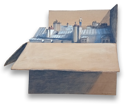 Parallèlement à cela il entreprend de développer en atelier et quelques fois sur mur, une peinture figurative exclusivement en noir et blanc très inspirée des gravures du XIXème siècle, mais aussi l’art névrotique et chronophage du papier découpé qu’il ne cesse de le tourmenter par gout du défi technique.